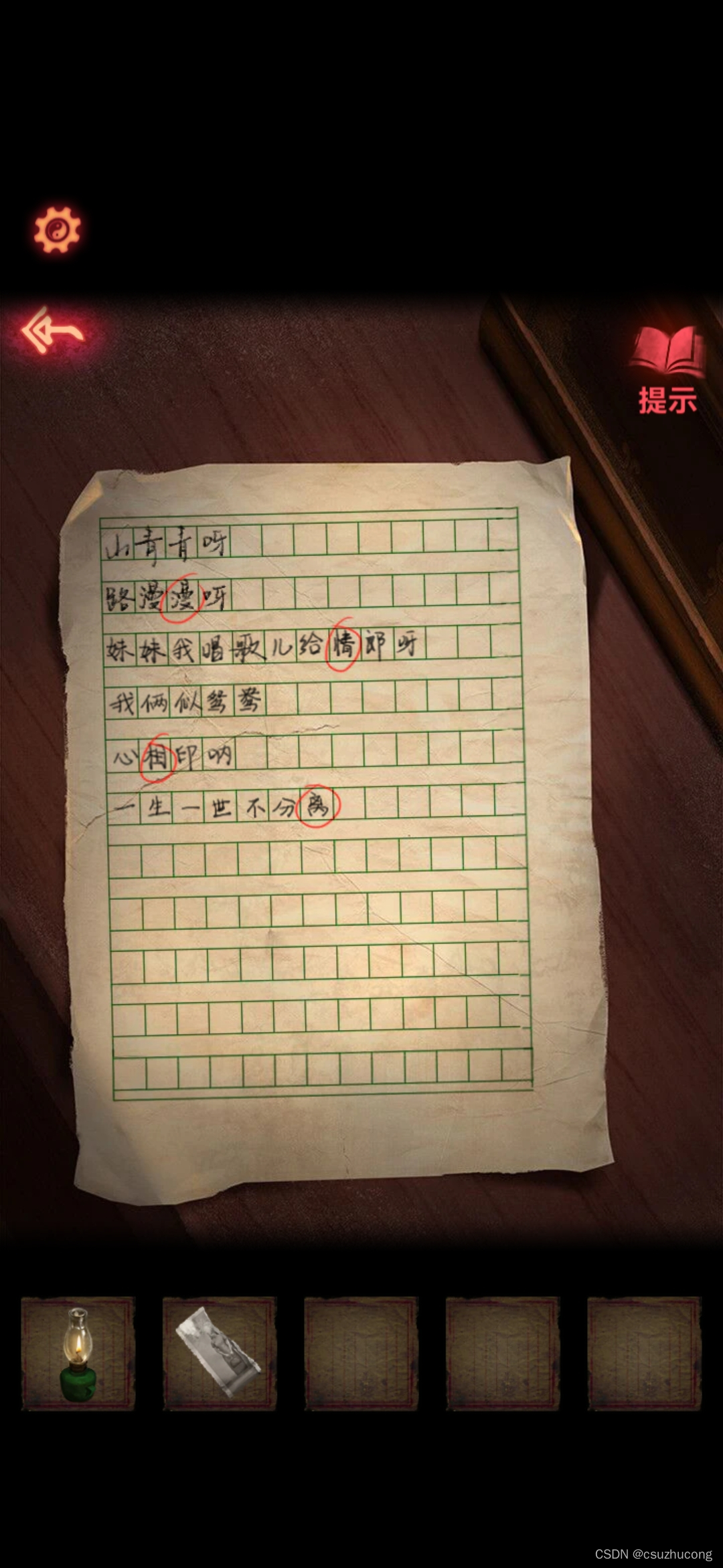 播放唱片,按照顺序听圆圈里面的4个字是啥,解开密码锁,结果提示线索不足。。。
