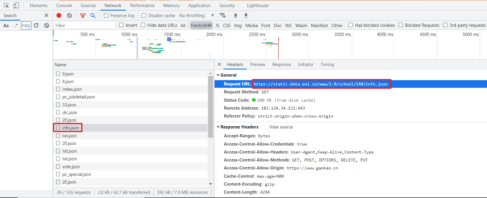 另外对比发现 https://static-data.eol.cn/www/2.0/school/140/info.json,关键参数 140 为学校ID,但ID不是连续的,所以,我们爬取时只能根据大致的学校数量进行爬取。