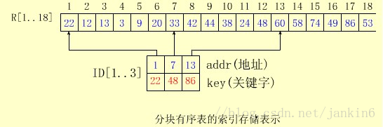 也叫分块查找, 把线性表分成若干个快.每个快中的元素存储顺序是任意的,但是块块的之间的必须按照关键字的大小排序