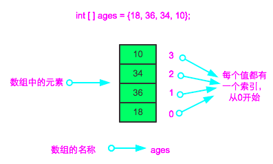 数组中的元素都可以通过下标来访问,下标从 0 开始,到数组长度 -1结束。例如,可以通过 ages[0] 获取数组中的第一个元素 18 ,ages[3] 就可以取到第四个元素 10。