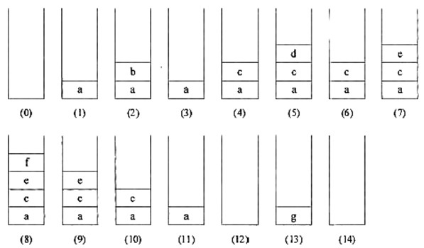 设栈S和队列Q的初始状态为空,元素a b c d e f g依次进入栈S。要求每个元素出栈后立即进入队列Q,若7个元素出队列的顺序为b d f e c a g,则栈S的容量最小应该是(58)。