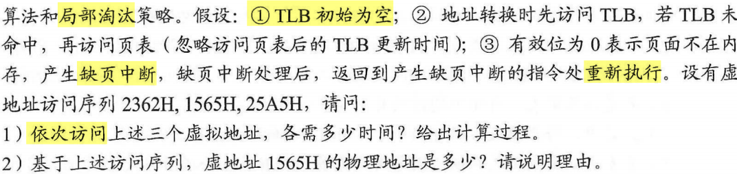 (3)第二问因为注意到初始的TLB是空的,所以只用先看页表,而注意对于第一次访问【2362】页面时,由于TLB中没有该2号的表项,所以要去页表中查找页表项,之后注意会更新TLB,即将2号虚页对应的页表项加入TLB快表——千万不要忘记这个。