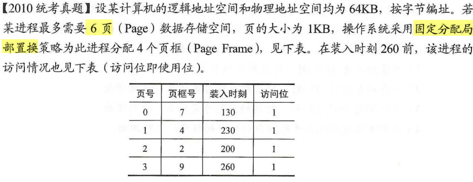 逻辑地址和物理地址均为16位(64KB),页内偏移为10位(1KB)。