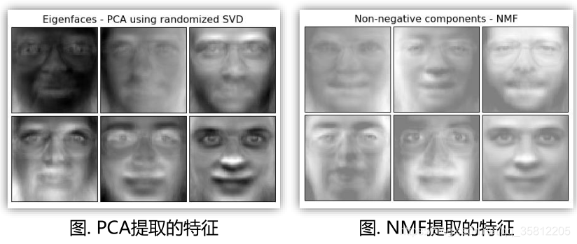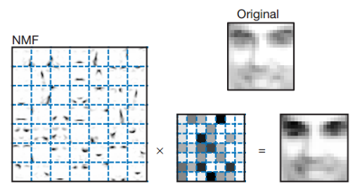 上图摘自NMF作者的论文,左侧为W矩阵,可以看出从原始图像中抽取出