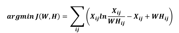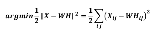 矩阵分解优化目标:最小化W矩阵H矩阵的乘积和原始矩阵之间的差别,目标函数如下: