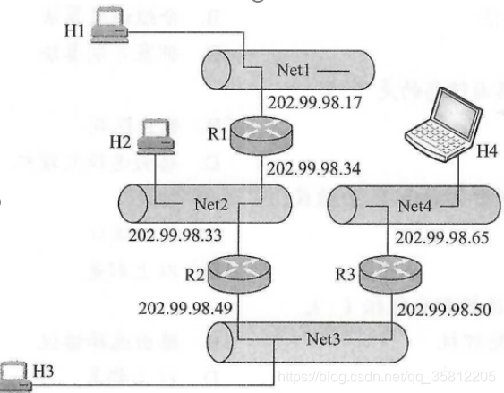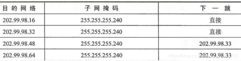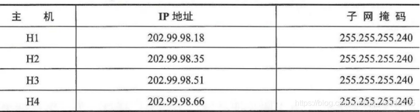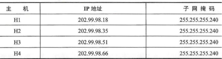 将H1,H2,H3,H4的IP地址分别与它们的子网掩码进行“与”操作,可得到4个子网的网络地址,分别为202.99.98.16、202.99.98.32、202.99.98.48、202.99.98.64,因此路由器R1到4个子网的路由表如下表: