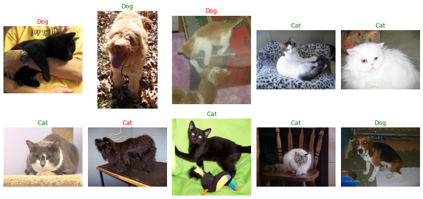让我们定义一个函数,该函数将获取图像文件路径及其标签的列表,并在网格中将其可视化。 正确的标签为绿色,错误预测的标签为红色。