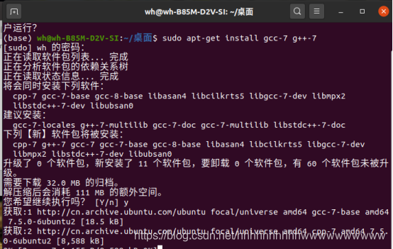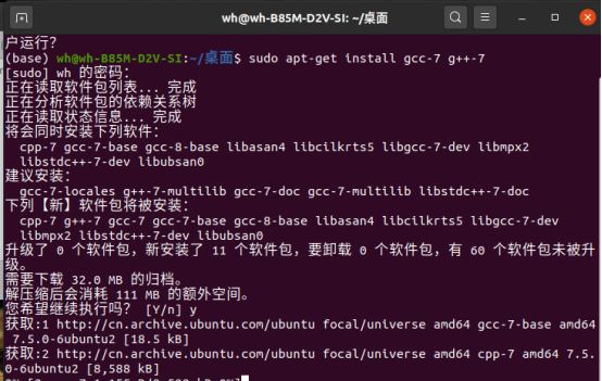 Ubuntu20.04自带的gcc版本为9.7.0,需要添加gcc7才可安装cuda10.2,输入命令安装gcc7