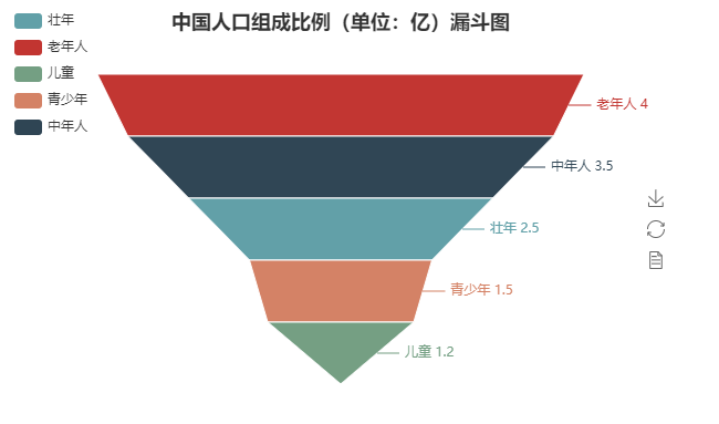 【摘要】 创建【demo4.py】测试类输入以下编码:from pyecharts import Funnelfunnel = Funnel("中国人口组成比例(单位:亿)漏斗图", width=600, height=400, title_pos='center')funnel.add("中国人口组成比例(单位:亿)", ['老年人','中年人','壮年','青少年','儿童'], [4,3...