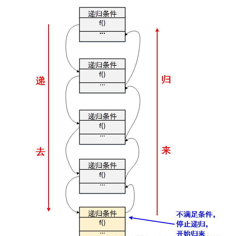 正如上面所描述的场景,递归就是有去(递去)有回(归来),如下图所示。“有去”是指:递归问题必须可以分解为若干个规模较小,与原问题形式相同的子问题,这些子问题可以用相同的解题思路来解决,就像上面例子中的钥匙可以打开后面所有门上的锁一样;“有回”是指 : 这些问题的演化过程是一个从大到小,由近及远的过程,并且会有一个明确的终点(临界点),一旦到达了这个临界点,就不用再往更小、更远的地方走下去。最后,从这个临界点开始,原路返回到原点,原问题解决。