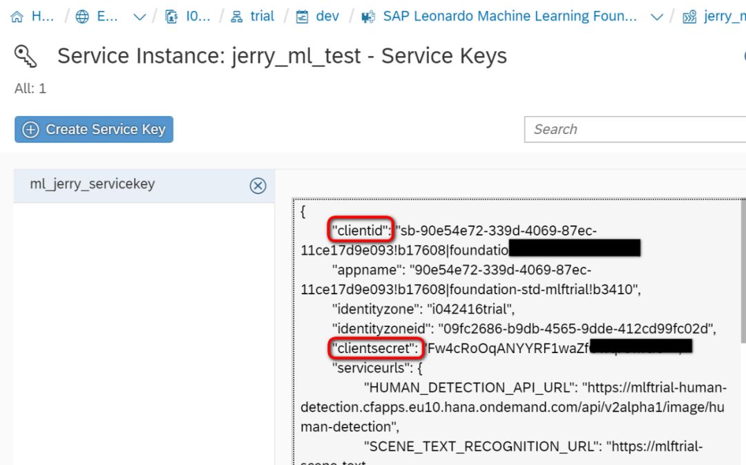 我们通过创建Service instance进而创建Service Key的目的,是为了得到下图的clientid和clientsecret。