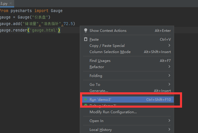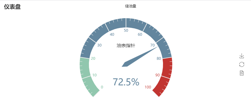 from pyecharts import Gaugegauge = Gauge("仪表盘")gauge.add("储油量","油表指针",72.5)gauge.render('gauge.html')