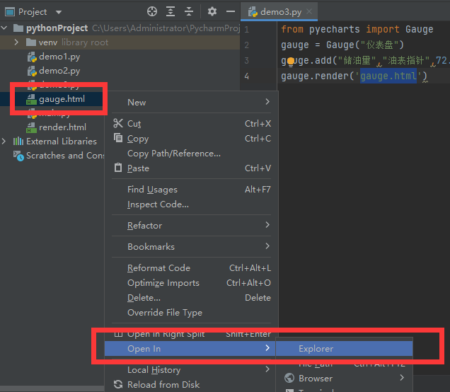 鼠标右键点击【gauga.html】->【Open In】->【Explorer】