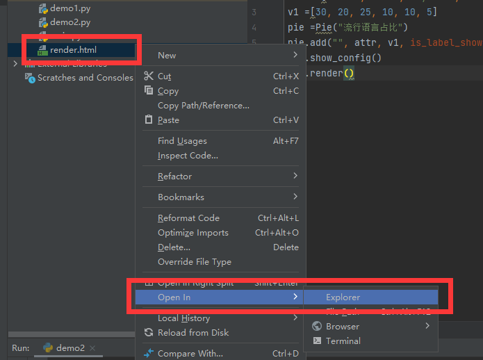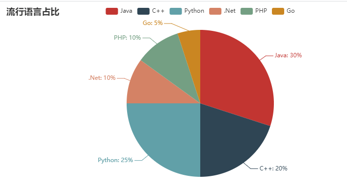 from pyecharts import Pieattr =["Java", "C++", "Python", ".Net", "PHP", "Go"]v1 =[30, 20, 25, 10, 10, 5]pie =Pie("流行语言占...