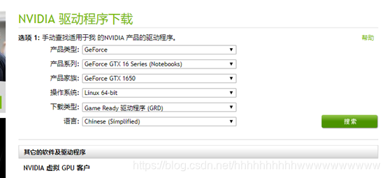第二种去官网下载驱动程序,https://www.nvidia.cn/Download/index.aspx?lang=cn。输入显卡的型号查找然后下载安装。手动搜索驱动程序,查找对应显卡的驱动。