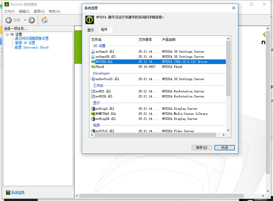 打开NVIDIV设置,如上图,双击打开软件。选择“帮助—》系统信息”,查看NVCUDA.DLL后面的信息。我电脑的版本十一10.0.132的,所以选择CUDA不能低于这个版本,否则会有兼容性的问题。