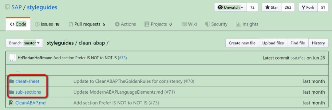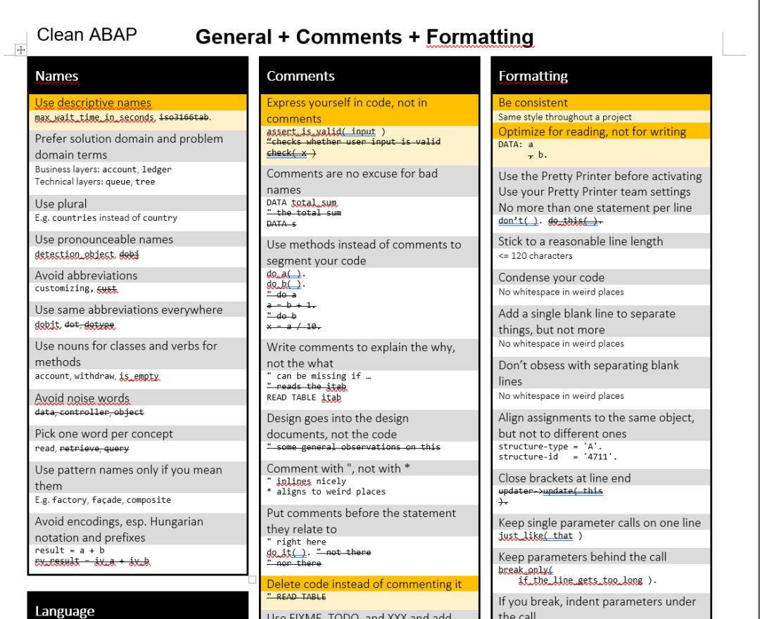 cheat-sheet文件夹里主要包含了CleanABAPCheatSheet和CleanABAPTheGoldenRules两个文件,前者包含了SAP认为要写出Clean的ABAP代码,需要遵循的准则和尽量避免的误区。