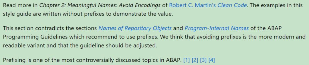 作者也深知这个建议和SAP官网help.sap.com上定义的ABAP编程规范里变量命名规范有相矛盾的地方,但还是坚持认为变量名不要前缀,是更加符合现代编程规范的做法,并且让变量有更好的可读性。