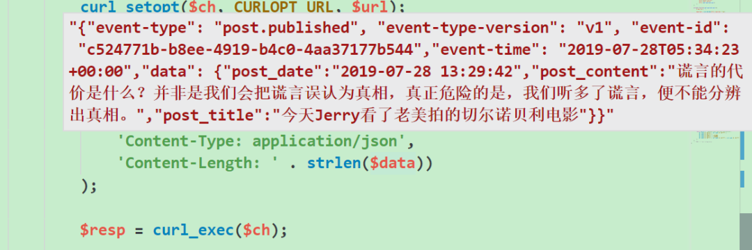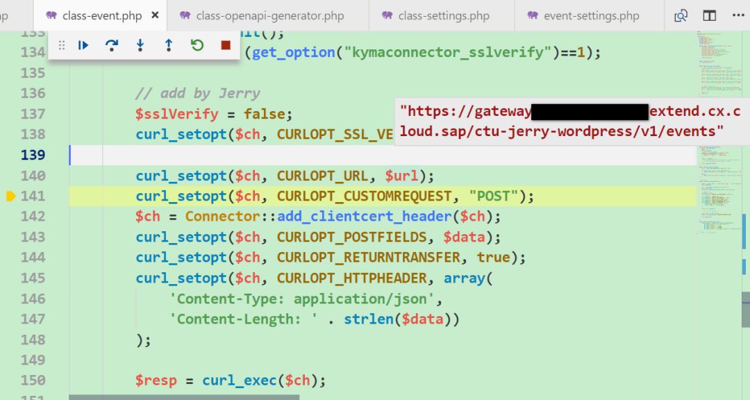 单步调试WordPress,发现发布博客的内容被发送到了指向Kyma事件处理的这个url:
