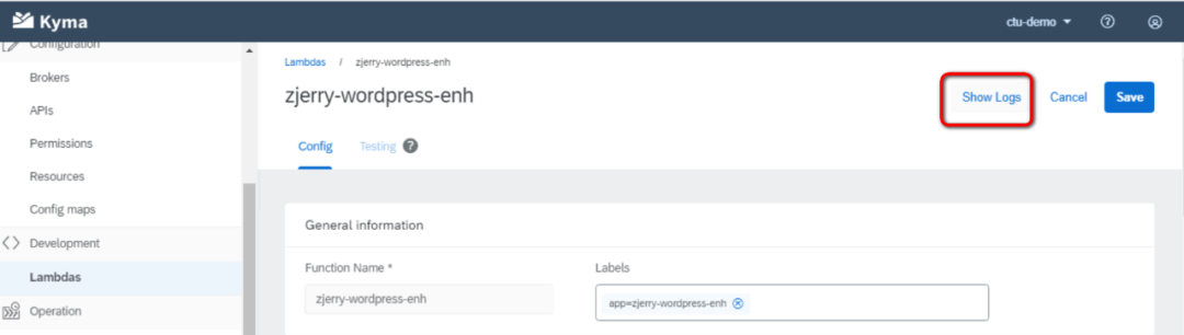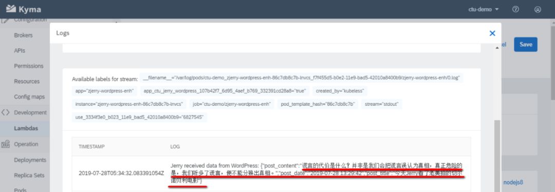 回到Kyma的Lambda界面,点击Show Logs查看日志,能发现WordPress发布的事件成功被Kyma的Lambda函数接收到了: