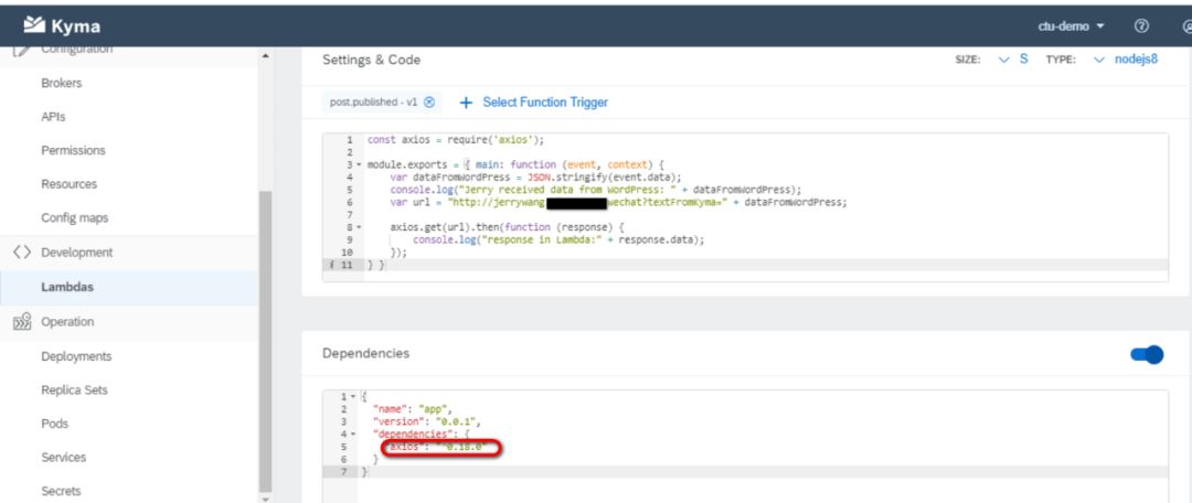 接下来在Lambda函数里的开发就是纯粹的nodejs编程工作了,使用nodejs提供的axios库,将WordPress传递给Kyma的博客内容从事件参数event里解析出来,调用微信接口发送给指定的微信用户。