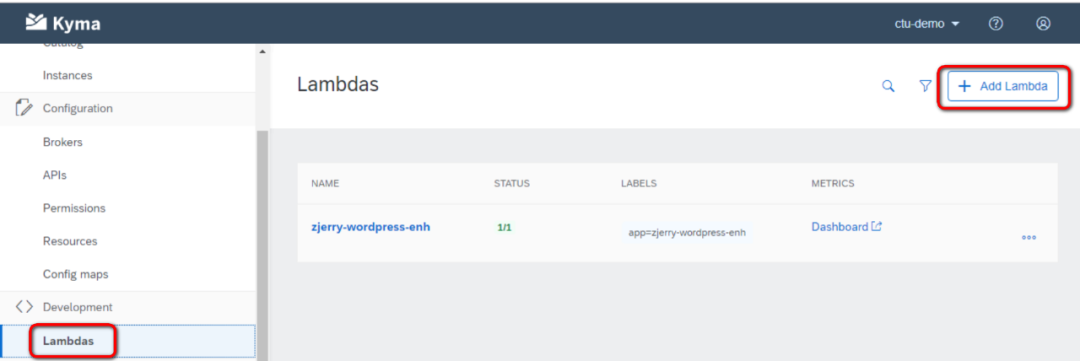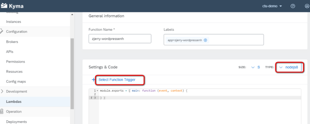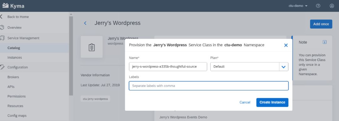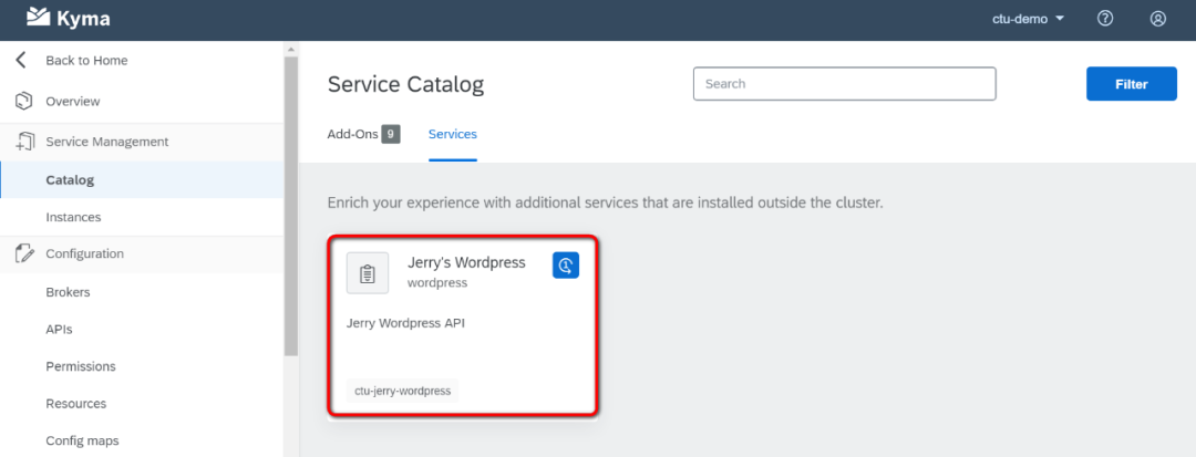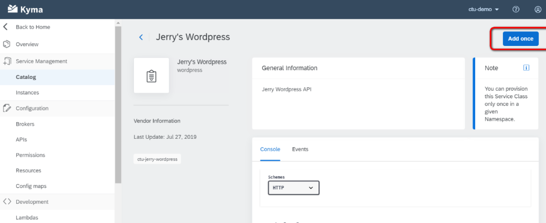 在按照前两篇文章的步骤做了之后,我们在SAP Kyma的服务目录(Service Catalog)下能看到从本地WordPress导入的服务(包含暴露的事件和API),大家可以把这个服务目录简单类比成SAP云平台的Service Market Place.