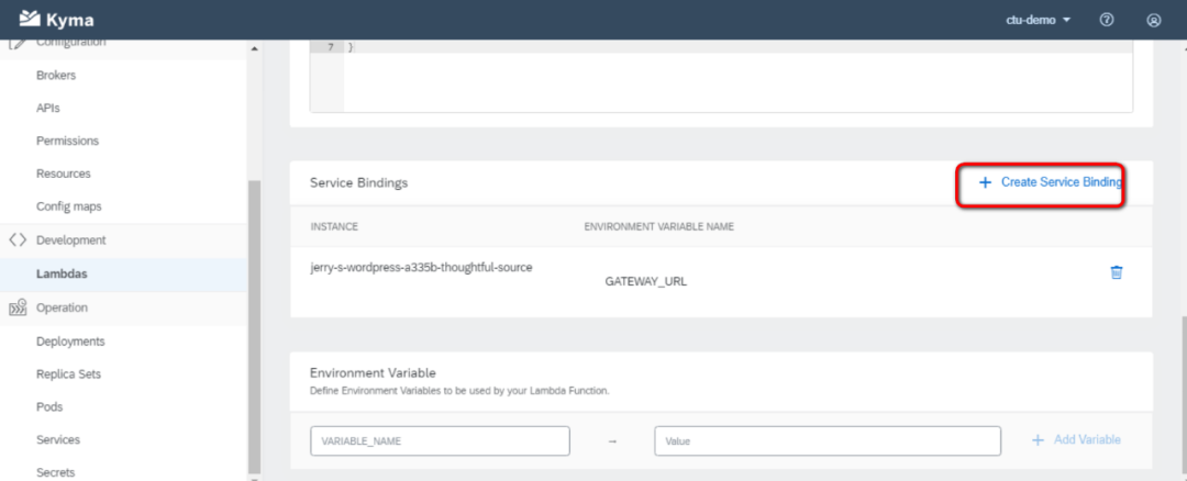 这个操作和SAP云平台CloudFoundry环境里的服务配置做法是一致的,所以有过SAP Cloud Platform开发经验的程序员,对SAP Kyma上这些配置能够很容易上手。