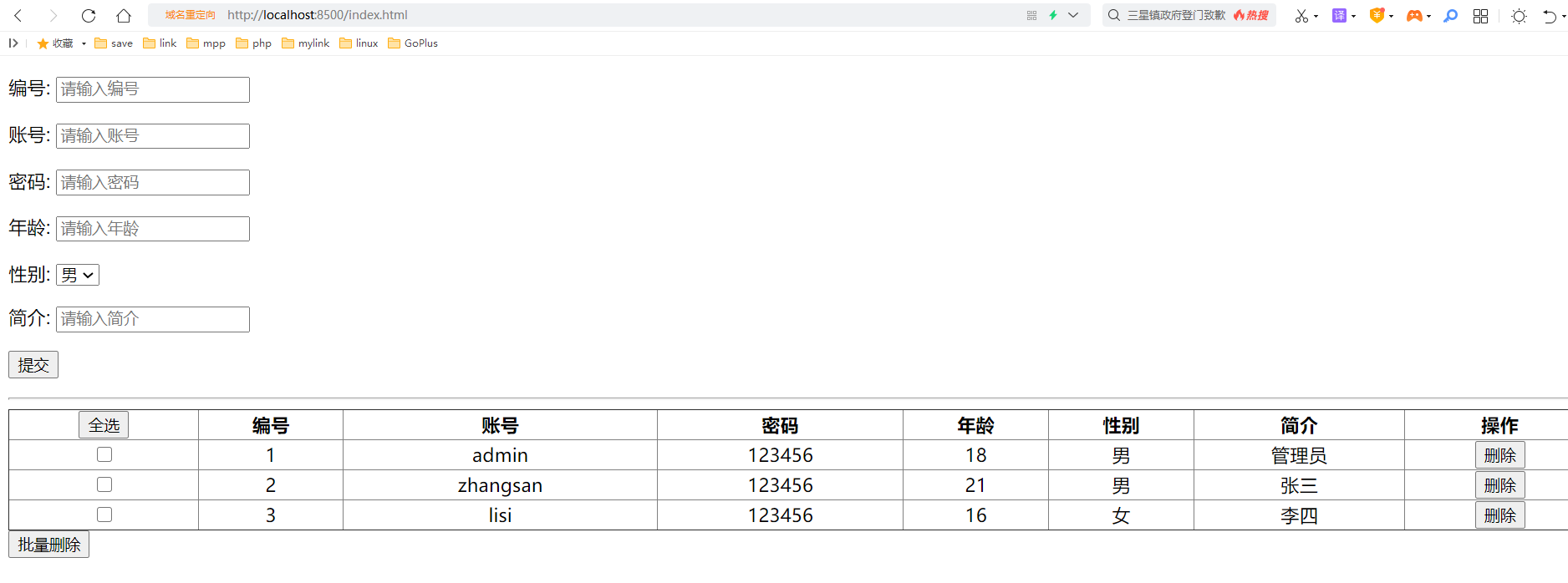 { "id": 3, "userName": "lisi", "passWord": "123456", "age": 16, sex: "女", "introduce": "李四" }