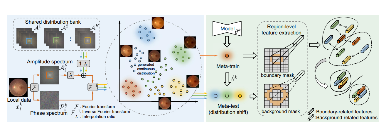 为了解决这个FedDG问题,我们的见解是使每个客户端都能够以保护隐私的方式访问多源数据分发。 这个想法是由以下知识所激发的:视觉心理物理学揭示了图像的低级分布(即样式)和高级语义可以分别通过频率空间中的振幅和相位频谱来捕获[13,42,57]。 我们可以考虑在客户端之间交换这些振幅频谱以传输分布信息(参见图1(b)),同时将相位频谱保持核心语义在本地进行隐私保护。 基于此,我们还设计了一种连续的频率空间插值机制,该机制可以在本地分布和已传输分布之间进行插值,以丰富每个本地客户端的已建立多域分布。 这促进了局部训练,从而受益于专用的密集分布空间,从而获得了领域不变性。 利用这些已建立的分布,我们通过情景训练范式将局部学习暴露于域分布变化,以增强局部参数的可推广性。 设计了一种新颖的元更新目标函数,以指导边界区域的跨域优化。 对于医学图像分割应用而言,这尤其重要,因为医学图像分割应用中的泛化误差通常来自解剖结构不明确边界处的不精确预测。