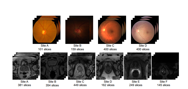我们采用来自公共数据集[52、10、40]的4个不同临床中心的视网膜眼底图像进行视盘和杯分割。为了进行预处理,我们将这些数据均匀地裁剪为800×800的磁盘区域,然后将裁剪区域的大小调整为384×384作为网络输入。我们进一步从公共数据集[2、21、31、33]划分的6个不同数据源中收集前列腺T2加权MRI图像,以进行前列腺MRI分割任务。对所有数据进行预处理,以使前列腺区域具有相似的视野,并在轴向平面中将其大小调整为384×384。然后,我们将数据分别归一化为强度值的零均值和单位方差。请注意,对于这两个任务,由于成像条件的变化,从不同临床中心获取的数据呈现出不同的分布。每个数据源的示例情况和样本数量如图3所示。在两个任务中采用了随机旋转,缩放和翻转的数据增强。为了进行评估,我们采用了两个常用的指标:骰子系数(Dice)和Hausdorff距离(HD),分别对整个物体区域和表面形状的分割结果进行定量评估。