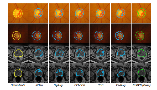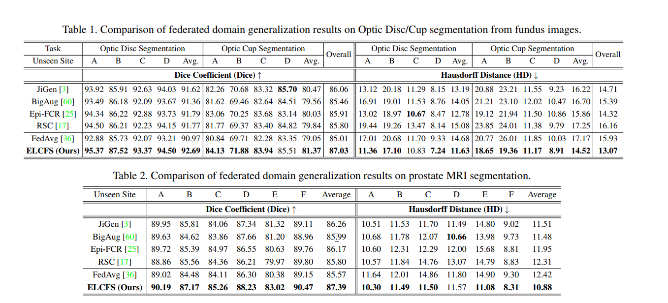 比较结果:表1给出了视网膜眼底分割的定量结果。我们看到,不同的DG方法可以比FedAvg或多或少地改善整体泛化性能。这归因于它们对本地学习的正则化作用以提取一般表示。与这些方法相比,我们的ELCFS在Dice和 HD既可用于光盘分割,也可用于杯分割。这得益于我们的频率空间插值机制,该机制向本地客户端提供了多域分布。具体来说,对于其他DG方法,他们的本地学习仍然只能访问单个分布,并且无法针对多样化分布空间中的域不变性对特征进行正则化。相反,我们的方法使局部学习能够充分利用多源分布的优势,并显着增强模糊边界区域周围特征的域不变性。此外,我们的ELCFS在所有看不见的域设置上都实现了对FedAvg的持续改进,Dice的整体性能提高了2.02%,HD的整体性能提高了2.86。相对边缘的。我们的ELCFS在六个未见的站点中获得最高的骰子,在大多数站点中获得高清。总体而言,我们的方法将Dice的FedAvg值从85.57%提高到87.39%,将HD值从12.42提高到10.88,优于其他DG方法。图4显示了分割结果,其中有两种情况来自于看不见的领域,无法完成每项任务。可以看出,我们的方法可以准确地分割结构并在未知分布的图像中描绘边界,而其他方法有时则无法做到。