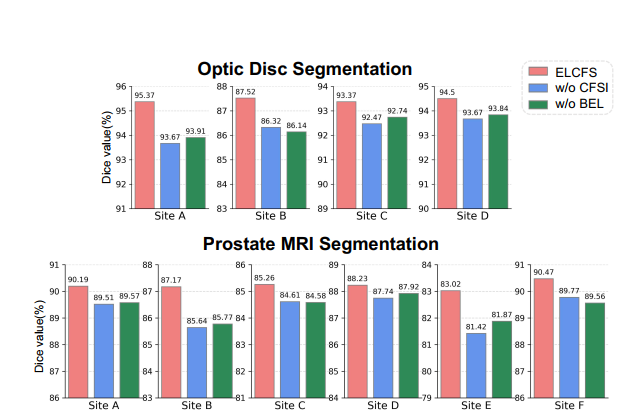 图8显示了前列腺MRI分割的结果,其中,我们在两个看不见的站点上展示了泛化结果,客户数量从1逐渐增加到K −1。正如预期的那样,使用单源数据训练的模型无法获得良好的结果部署到看不见的域时。当更多的客户参加联合培训时,泛化性能会提高,这是合理的,因为汇总来自多个来源的数据可以涵盖更全面的数据分发。特别是,我们的ELCFS在具有不同客户数量的所有泛化设置上始终优于FedAvg,这证明了我们的方法利用分布式数据源来增强联合学习模型的泛化性的稳定有效性。