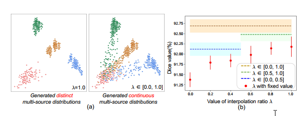 粉红色的点表示客户端的本地数据,其他点表示使用来自不同客户端的幅度谱生成的转换后的数据。似乎固定λ(左)将导致几个不同的分布,而连续插值机制(右)可以平滑地桥接不同的分布以丰富已建立的多域分布。这促进了局部学习以在预定的密集分布空间中实现域不变性。 然后,我们分析选择λ对模型性能的影响,为此,我们以0.0到1.0的固定值(步长为0.2)进行实验,并在[0.0,0.5],[0.5,1.0]范围内进行连续采样和[0.0,1.0]。如图6(b)所示,与不传输任何分布信息(即λ= 0)相比,将λ> 0设置为固定值可以始终提高模型性能。此外,连续采样可以进一步提高性能,并且[0.0,1.0]的采样范围可产生最佳结果,这反映出连续分布空间对于域泛化的好处。