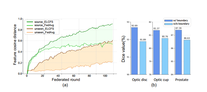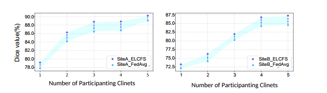 模棱两可的边界区域的可辨性:我们绘制了边界相关特征和背景相关特征之间的余弦距离,即E [hi bd hi bg],以分析边界空间周围的语义特征空间如何受到我们方法的影响。在图7(a)中,两条绿线分别表示从训练源域中抽取的样本的ELCFS和FedAvg基线中特征距离的增长。我们可以看到,ELCFS产生了更长的特征距离,表明边界和周围背景区域的特征可以在我们的方法中更好地分离。对于两条黄线,样本特征是从看不见的区域中绘制的。不出所料,该距离不如源域高,但是我们的方法也比FedAvg具有更高的裕度。我们还定量分析了Lboundary对模型性能的影响。从图7(b)中可以看出,从元优化中删除此目标会导致不同任务中的泛化性能出现一致的性能下降。 参与客户数量的影响:我们进一步分析了当参加联合学习的医院数量不同时,我们的方法和FedAvg的泛化性能将受到怎样的影响。