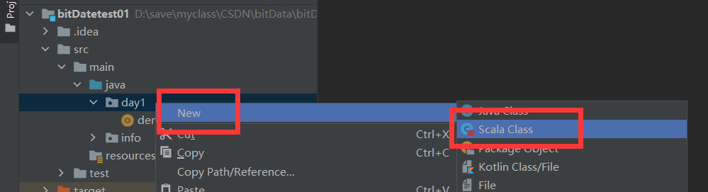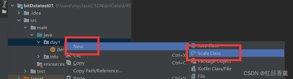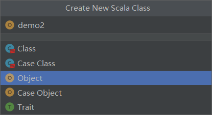 创建测试类【day1/demo2.scalc】 ,类型选择Object