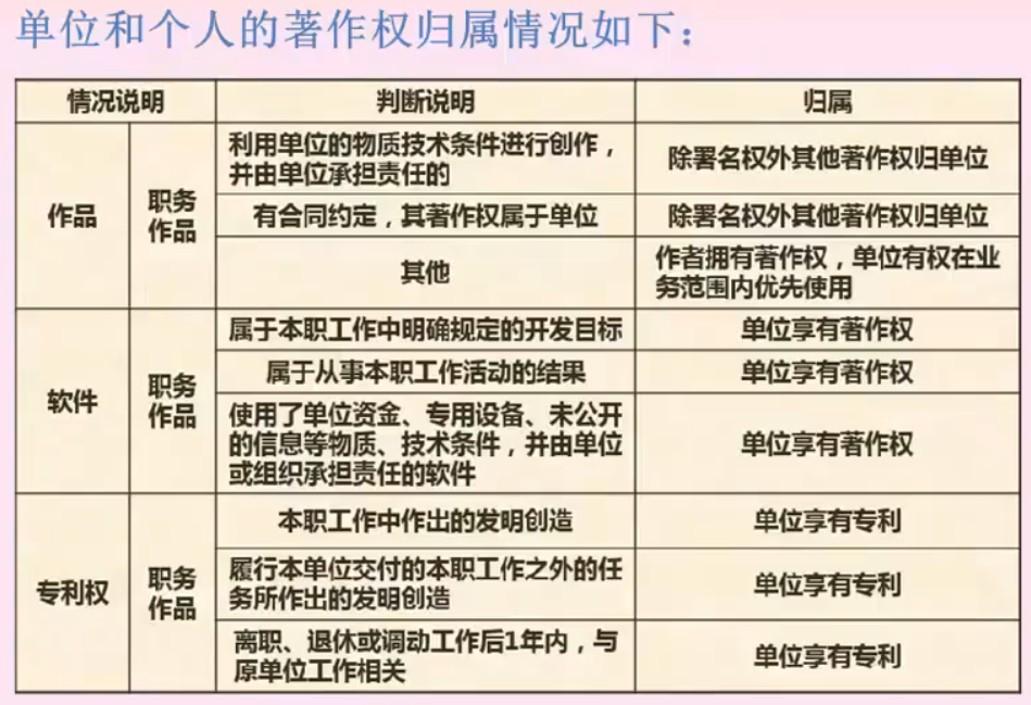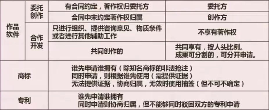 - 专利权:谁先申请就归谁,若同一天申请,则双方协商或者以抽签方式决定。