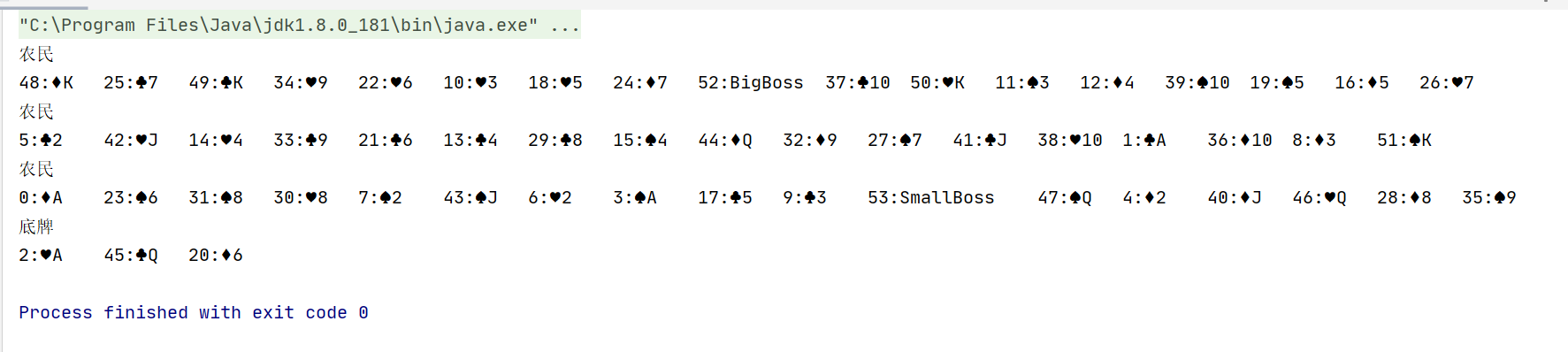 【摘要】 分牌:将原列表分为4个列表,分别是3个农民与底牌package com.item.test;import java.util.ArrayList;import java.util.Collection;import java.util.Collections;import java.util.List;public class Action { public static void ...