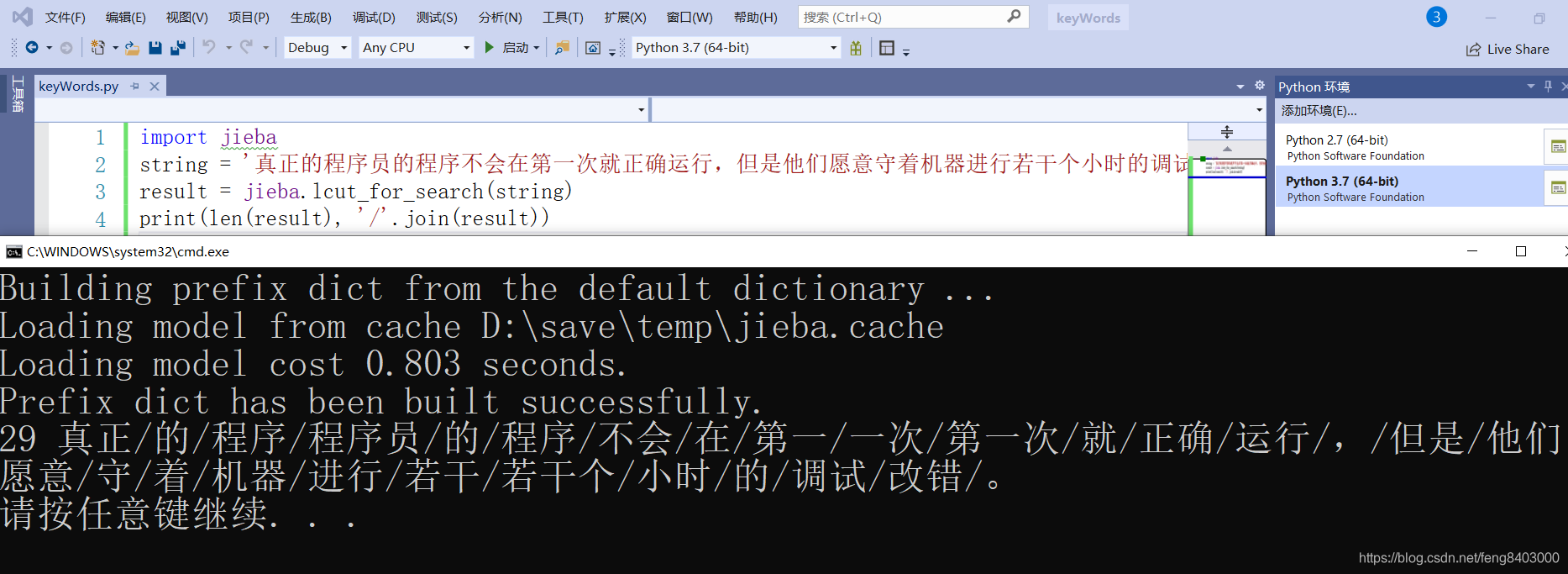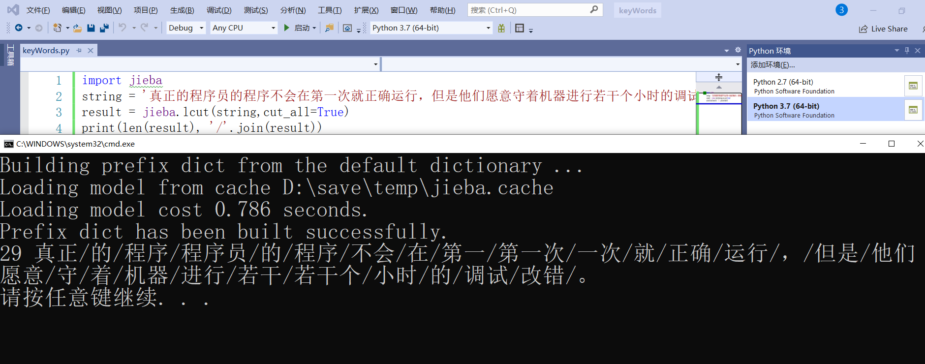 2、jieba精确模式分词使用lcut()函数,类似cut()函数,其参数和cut()函数是一致的,只不过返回结果是列表而不是生成器,默认使用精确模式。