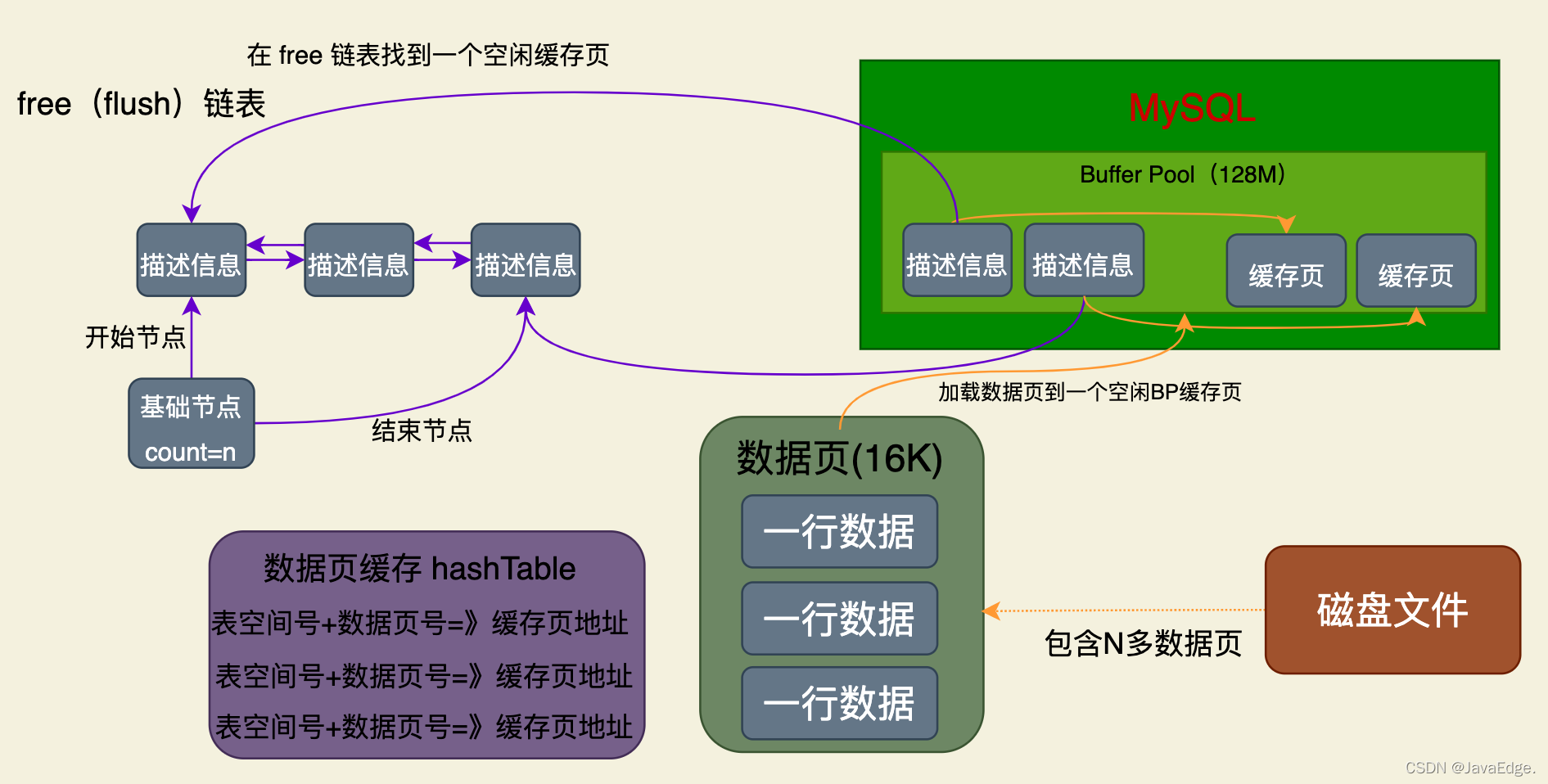 执行CRUD都会将磁盘数据页加载到缓存页,那在加载数据到缓存页时,必然是要加载到空闲缓存页,所以必须要从free中找个空闲缓存页,然后把磁盘数据页加载到该空闲缓存页
