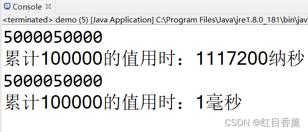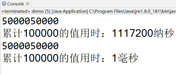 System.out.println("累计"+count+"的值用时:"+(end-start)+"纳秒");