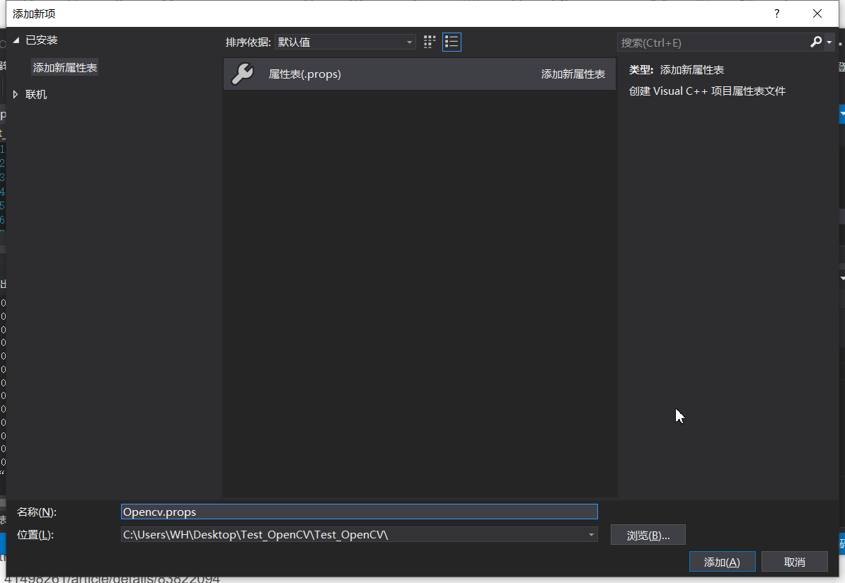 这个文件可以被所有的Debug|64 项目共用,随意给它命名【名字.props】。保存位置也最好放到公共目录下(便于寻找)。名称和路径设置完成后,就可以点击”Add“按钮。