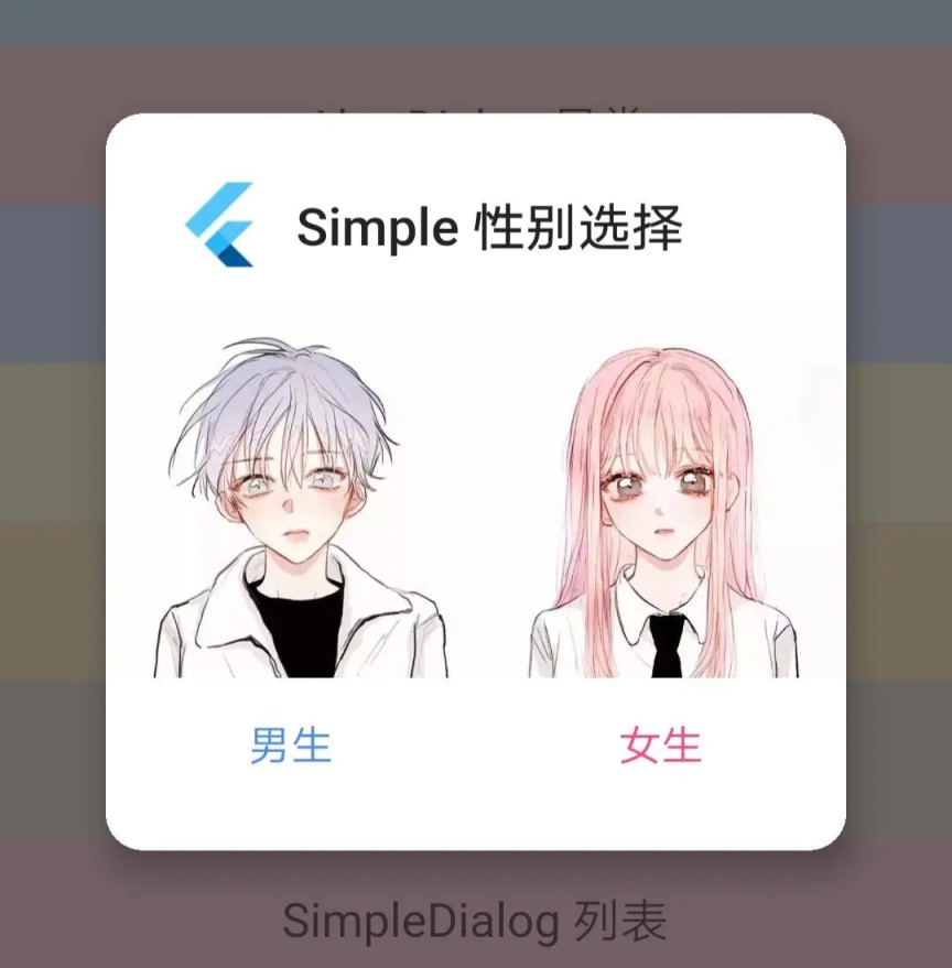 分析源码,SimpleDialog 比 AlertDialog 要简单,只是单独多一个 titlePadding;消息主体默认是 List<Widget>;基本 SimpleDialog 可实现的效果 AlertDialog 均可实现;
