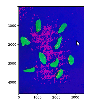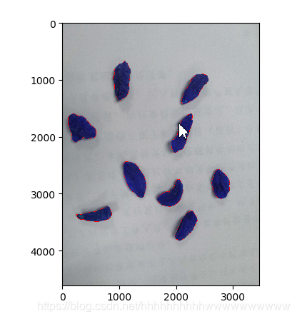 现在我们使用轮廓检测,在我们“模糊”的图像中找到枸杞。为了去除小的和无关紧要的轮廓,我们只选择那些面积大于2000的轮廓(任意值,是超参数)。