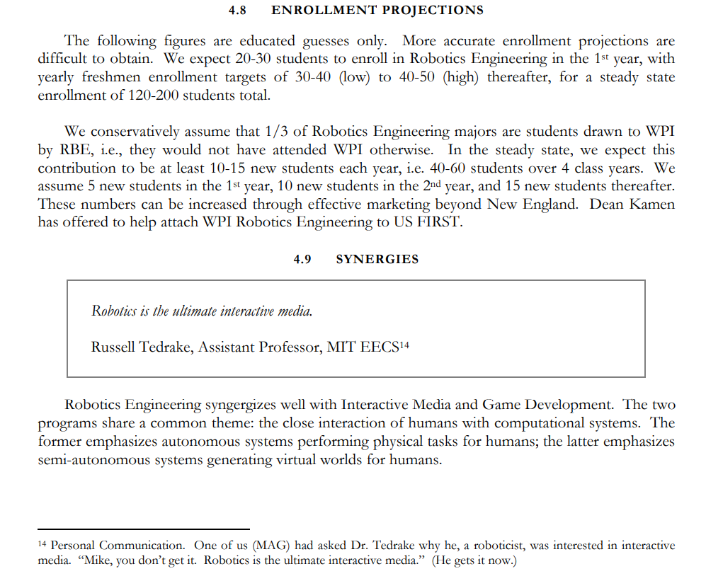 许多大学提供机器人课程。 一些,包括 WPI,提供集中或类似的,如未成年人、集群、线程和焦点领域。 据我们所知,尽管普利茅斯(英国)大学一直在提供机器人和自动化学士学位,但美国没有一所大学提供机器人学本科学位。 自 2004 年以来的课程,重点是工业机器人。