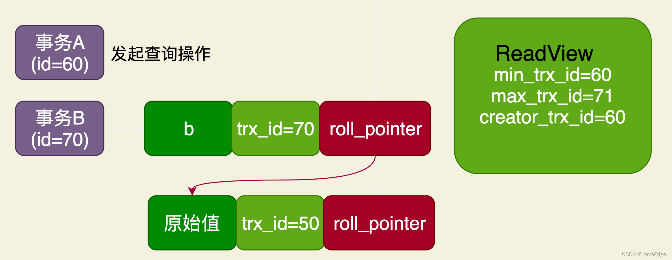 这时事务A发起查询,发现当前这条数据的trx_id=70。即属于ReadView的事务id范围之间,说明是他生成ReadView之前就有这个活跃的事务,是这个事务修改了这条数据的值,但此时事务B还没提交,所以ReadView的m_ids活跃事务列表里,有[60, 70]两个id,此时根据ReadView机制,事务A无法查到事务B修改的值b。