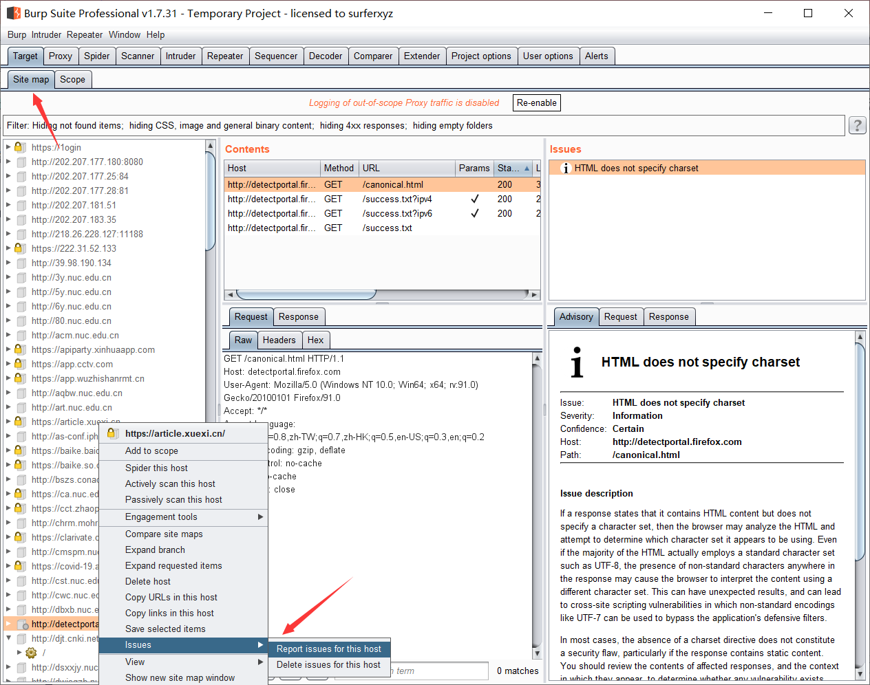 右键我们需要的网站—>Actively scan this host