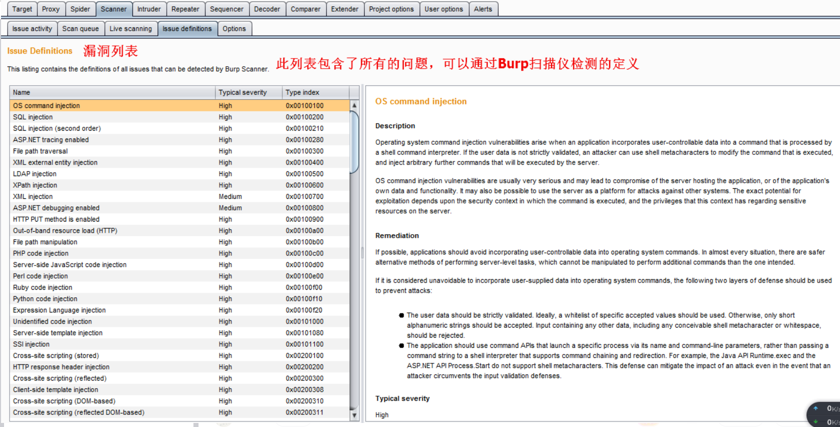 漏洞列表,列出BP的漏洞库,就是BP可以扫描到的漏洞