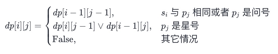 - 其中 ∨ 表示逻辑或运算,如果不使用这个星号,那么就会从 dp[i][j−1] 转移而来;如果使用这个星号,那么就会从 dp[i−1][j] 转移而来。