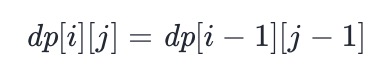 - 其中 ∧ 表示逻辑与运算,也就是说,dp[i][j] 为真,当且仅当 dp[i−1][j−1] 为真,并且 si 与 pj 相同。