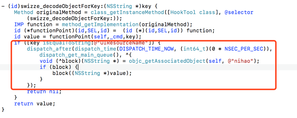 Method originalMethod = class_getInstanceMethod([HookTool class], @selector(swizzle_decodeObjectForKey:));